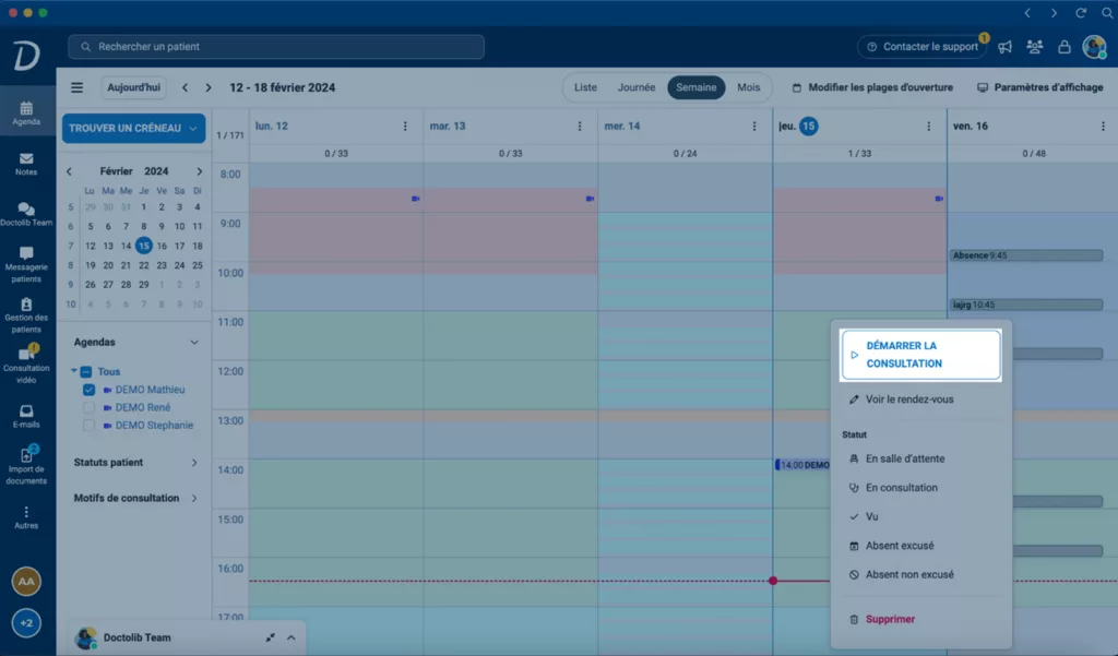 ✅ Vous avez démarré la consultation, le statut du rendez-vous devient En consultation automatiquement.