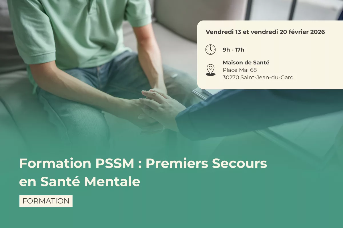 La CPTS Entre Châtaigne et Micocoule propose une formation Premiers Secours en Santé Mentale (PSSM). Cette formation vise à vous donner les clés pour identifier et soutenir rapidement une personne en détresse psychologique. Elle aborde les signes de détresse, les techniques d’écoute et d’accompagnement, ainsi que l’orientation vers les ressources adaptées. Des exercices pratiques et mises en situation permettent de renforcer l’efficacité de l’intervention.